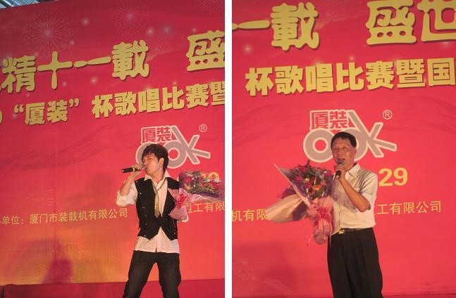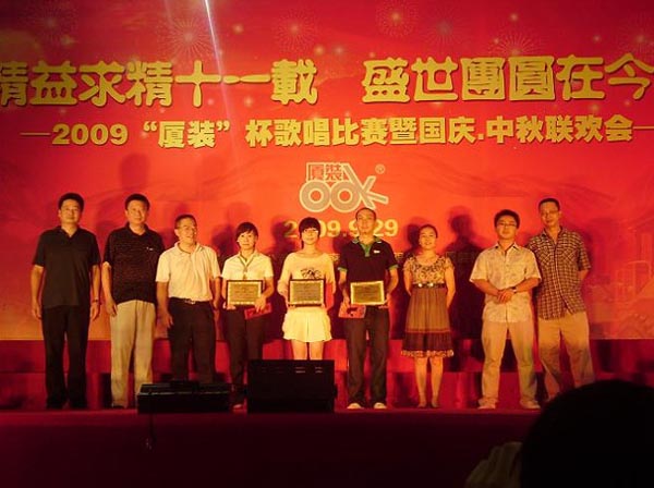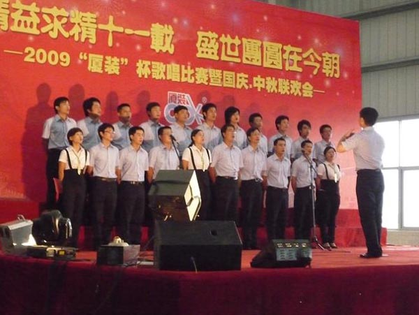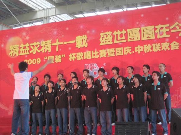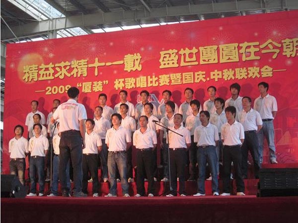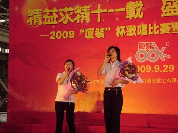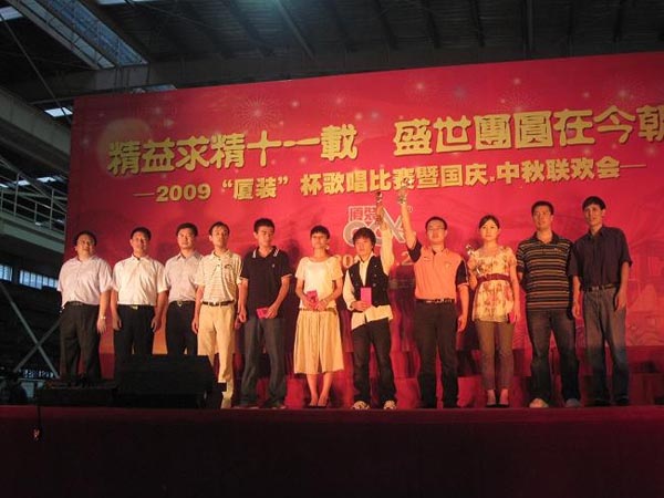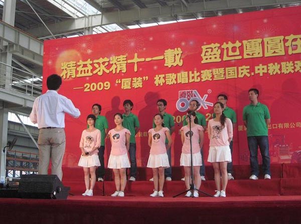 9月29日下午,2009年度“廈裝杯”歌唱比賽在廈裝公司總裝車間舉行。此次歌唱比賽以“精益求精十一載、盛世團圓在今朝”為主題,賀祖國60周年華誕、喜迎中秋、慶祝廈裝成立11周年。公司及各部門從6月份開始籌備此次比賽,此次比賽分為集體組和個人組,集體組(合唱)以部門為單位,最終有6支隊進入當天的決賽,個人組通過先前的部門推薦及預賽選拔,最終有11人闖入決賽。
